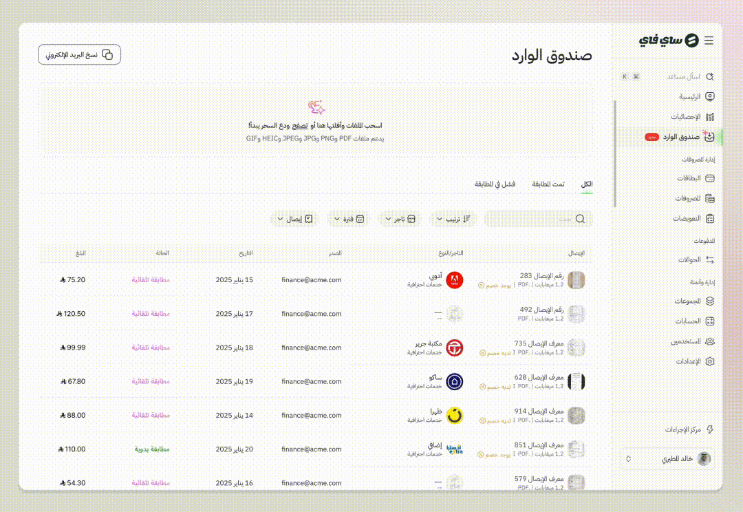 يتم مسح الإيصالات التي تُرسل أو تُسقط بالجملة في الصندوق تلقائيًا ومطابقتها مع المعاملات الصحيحة.