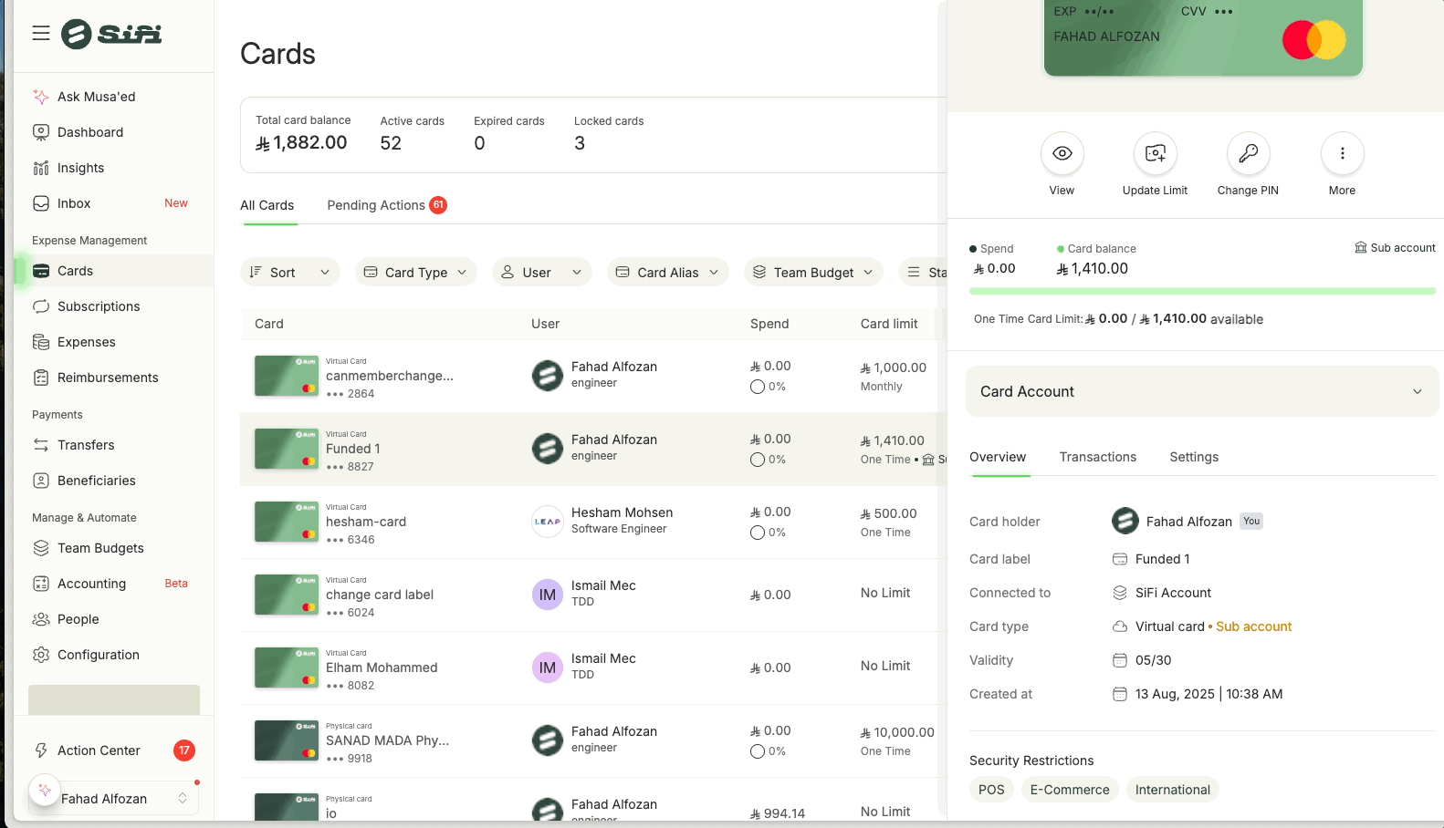 With SiFi, you can set custom spending limits for every card issued. These limits give you control over how funds are used, ensure compliance with company policies, and prevent overspending. 👉 Important: Card limits do not reduce your company ...