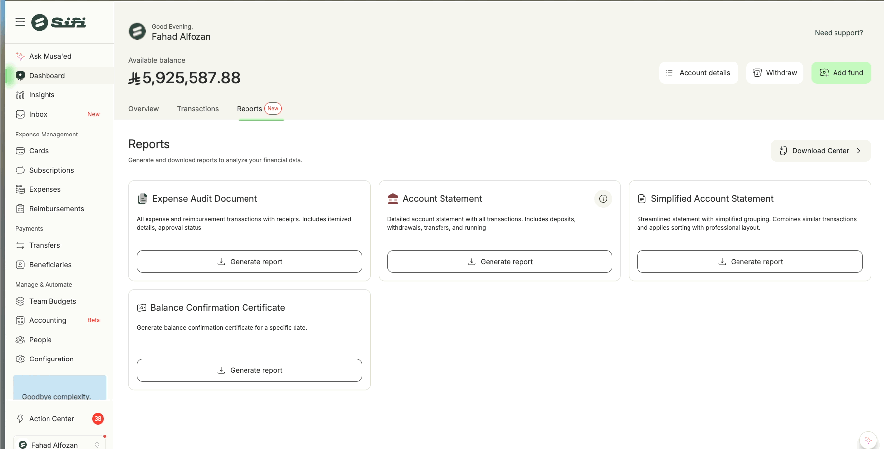 SiFi makes audits easier by providing a comprehensive Expense Audit Document. This feature lets you download all expenses, reimbursements, and transfers in one audit-ready PDF file complete with receipts and transaction details.
