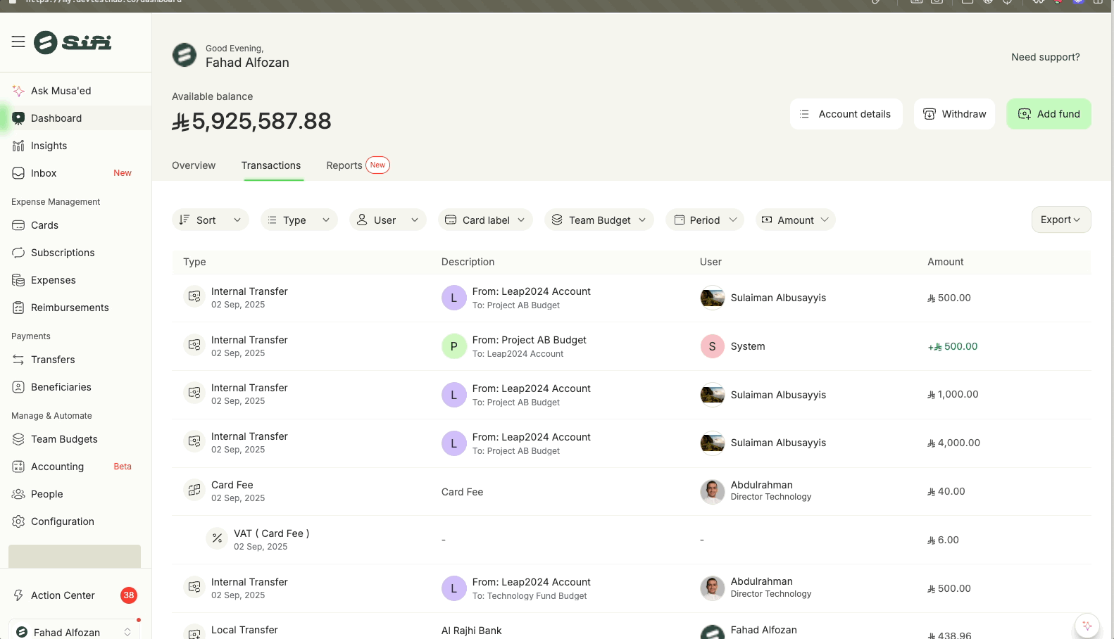 Your Account Transactions section provides a full overview of all money movements within your companyβs primary SiFi account. This ensures transparency, easier reconciliation, and complete visibility into financial activities.